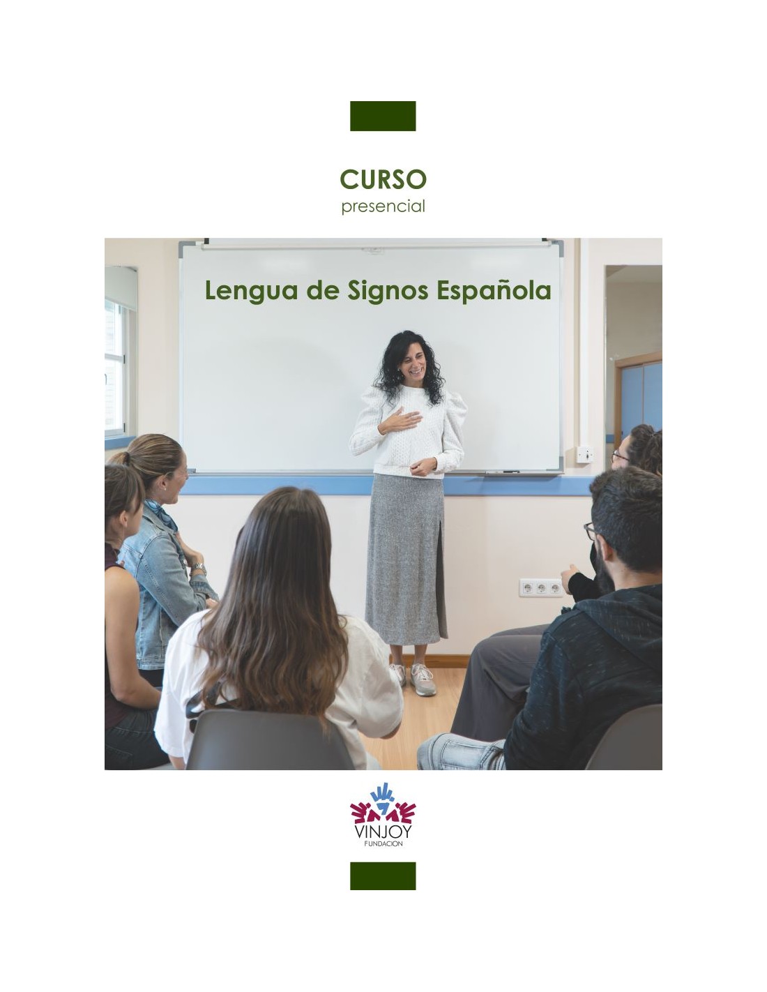 ¿Alguna vez has querido aprender Lengua de Signos Española? En la Fundación Vinjoy, te ofrecemos la oportunidad de sumergirte en el aprendizaje de la LSE, a través de nuestros cursos presenciales de Nivel A1, A2, B1, B2.1., B2.2. y C1.1. Adquiere las habilidades y la confianza para interactuar de forma fluida con las personas sordas y contribuir a una sociedad más inclusiva.